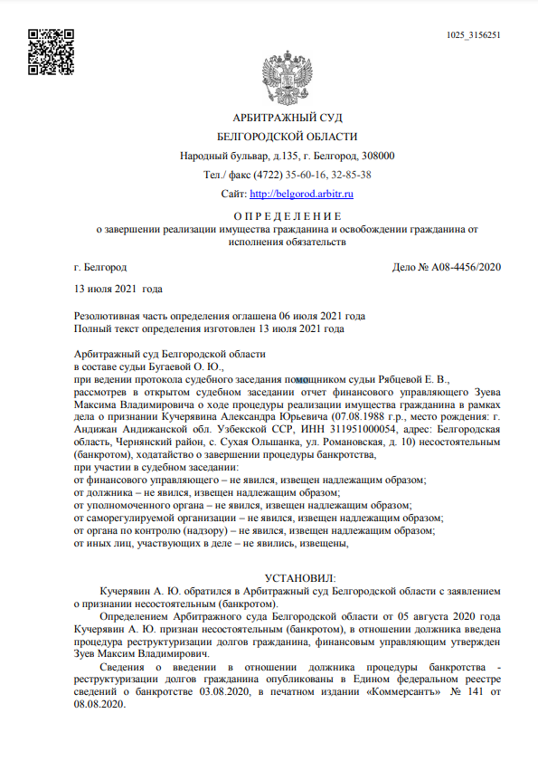 Определением Арбитражного суда Белгородской области от 05 августа 2020 года Кучерявин А. Ю. признан несостоятельным (банкротом), в отношении должника введена процедура реструктуризации долгов гражданина, финансовым управляющим утвержден Зуев Максим Владимирович.