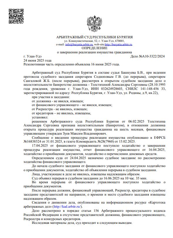 Завершить процедуру реализации имущества Толстихиной Александры Сергеевны.