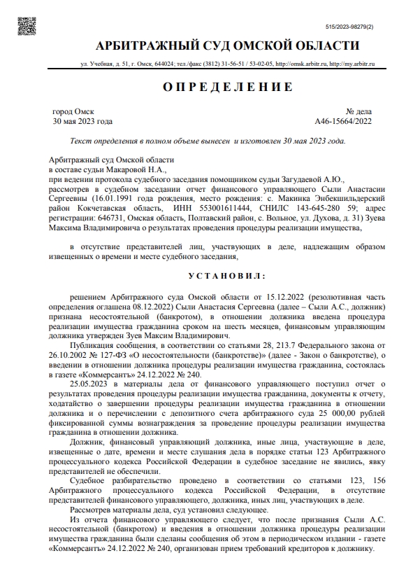 Арбитражный суд Омской области определил: процедуру реализации имущества гражданина в отношении Сыли Анастасии Сергеевны завершить.