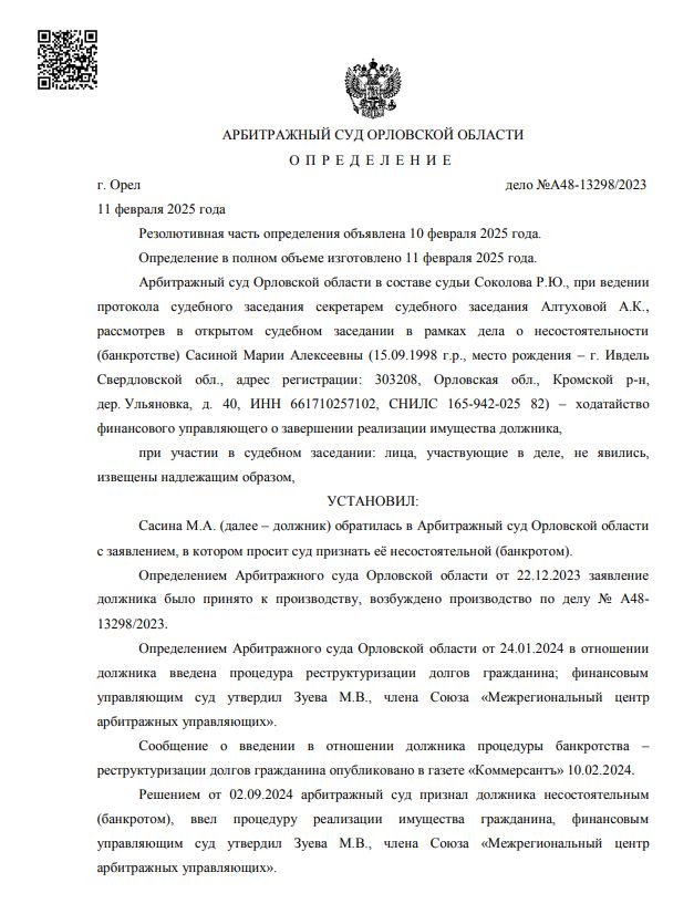Завершение процедуры реализации имущества должника Сасиной Марии Алексеевны.