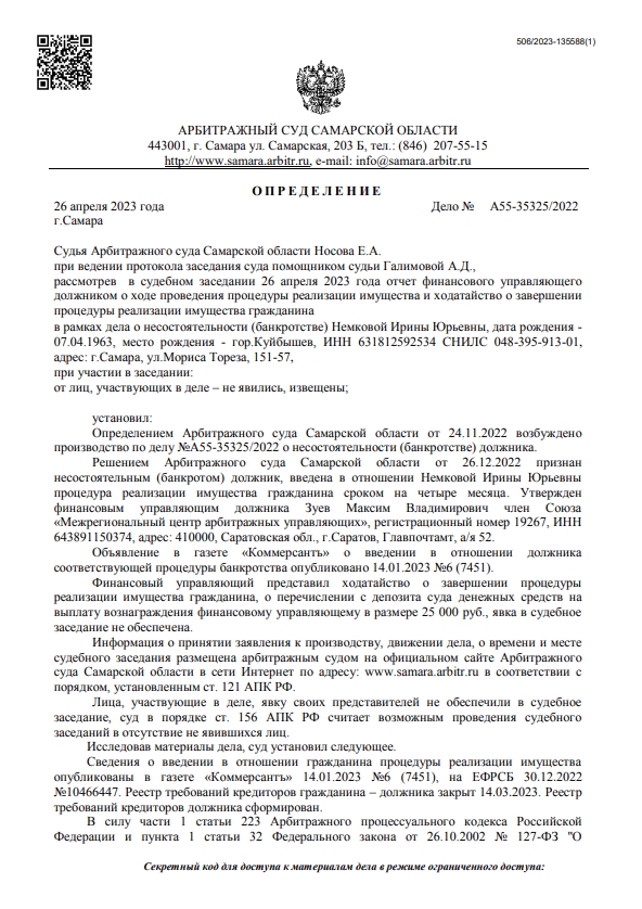 Завершить процедуру реализации имущества гражданина в отношении Немковой Ирины Юрьевны, дата рождения - 07.04.1963, место рождения - гор.Куйбышев.