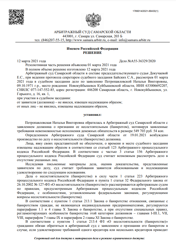 Петропавловская Наталья Викторовна обратилась в Арбитражный суд Самарской области с заявлением должника о признании ее несостоятельным (банкротом), мотивируя заявленные требования невозможностью исполнения денежных обязательств в размере 549 703 руб. 54 коп. Определением Арбитражного суда Самарской области от 19.01.2021 возбуждено производство по делу о несостоятельности (банкротстве) должника. [...]