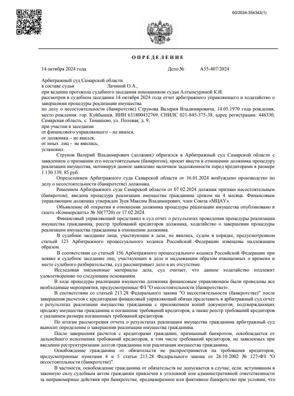 Завершение процедуры реализации имущества должника Бабыкиной Анны Александровны.