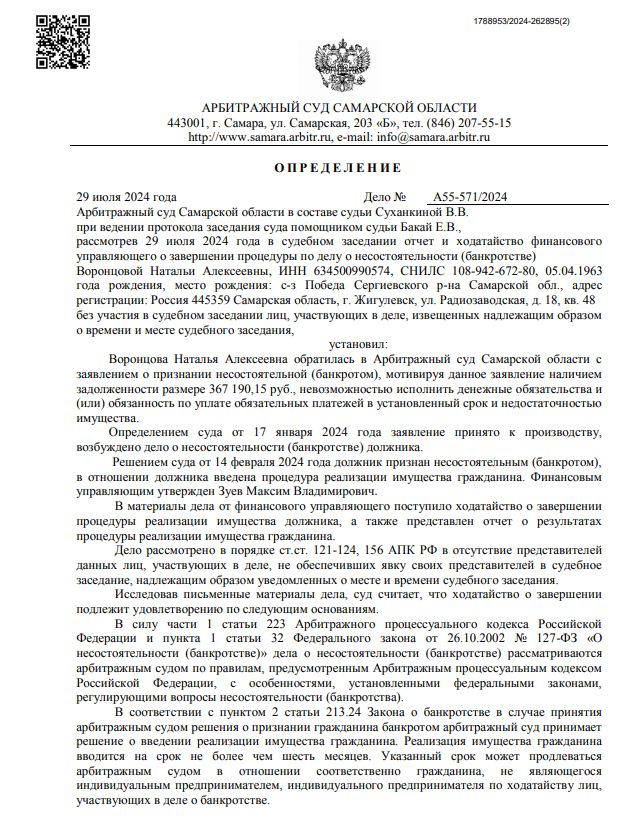 Освободить Воронцову Наталью Алексеевну от дальнейшего исполнения требований кредиторов, в том числе требований кредиторов, не заявленных при введении процедур банкротства, за исключением случаев, предусмотренных Федеральным законом от 26.10.2002 № 127-ФЗ «О несостоятельности (банкротстве)».