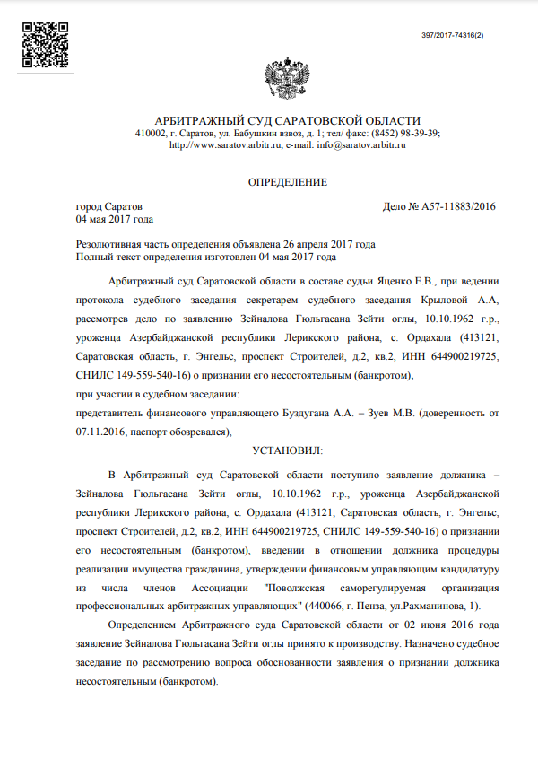 В Арбитражный суд Саратовской области поступило заявление должника –