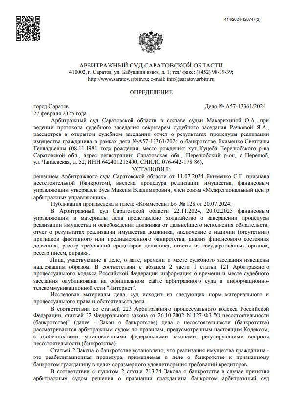 Якименко Светлану Геннадьевну от дальнейшего исполнения требований кредиторов, в том числе требований кредиторов, не заявленных при введении реализации имущества гражданина, освободить.