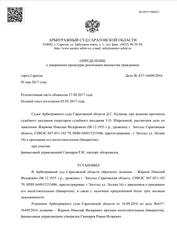 В Арбитражный суд Саратовской области обратился должник - Жирнов Николай