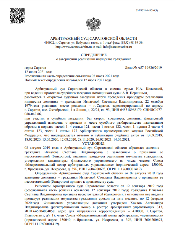 заявление должника – гражданки Игнатовой Светланы Владимировны о признании ее