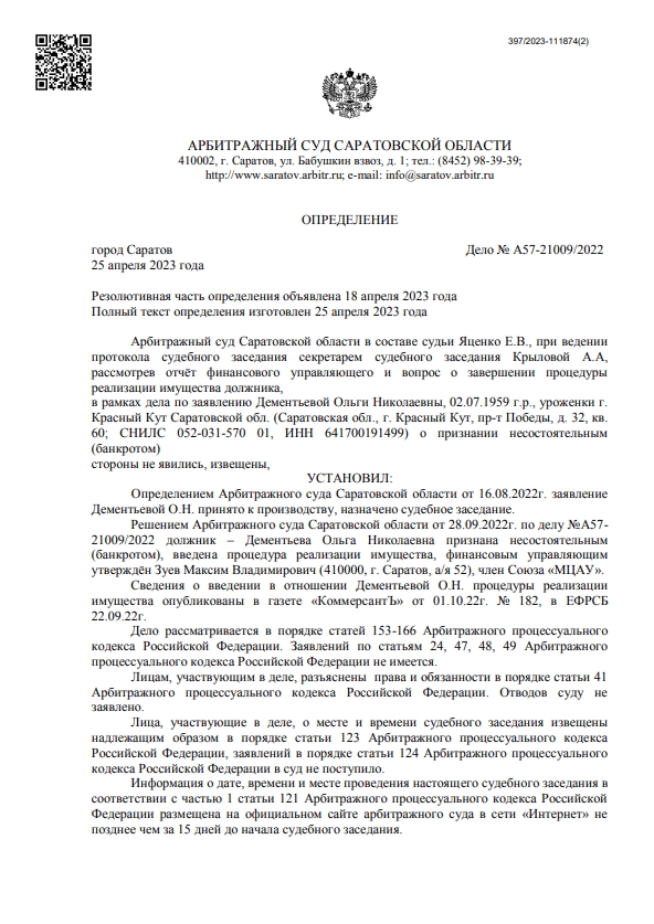Завершить процедуру реализации имущества гражданина в отношении должника - Дементьевой Ольги Николаевны, 02.07.1959 г.р., уроженки г. Красный Кут Саратовской обл.