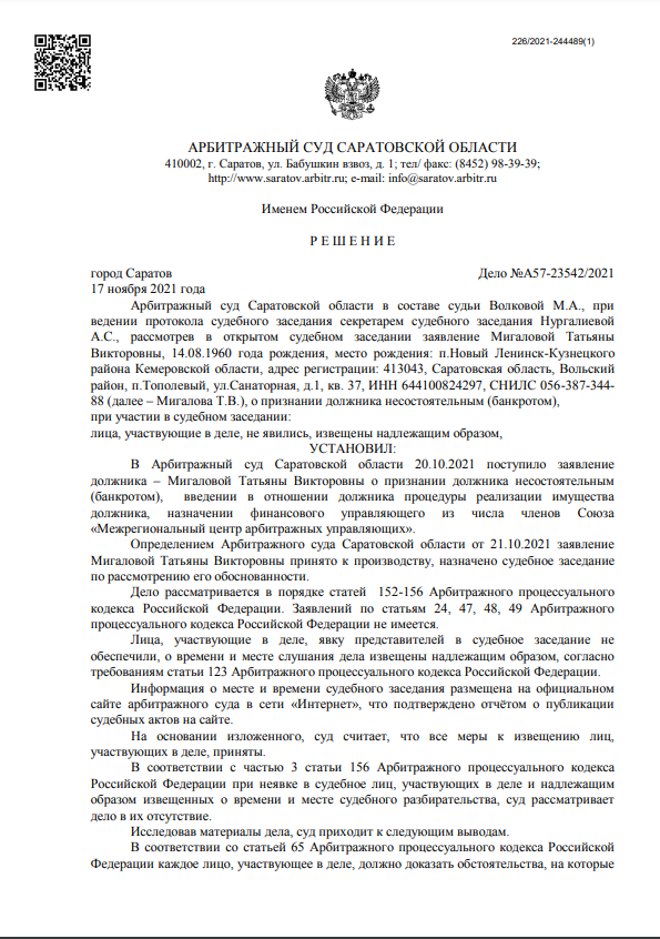 Руководствуясь статьями 52, 59, 213.1, 213.6, 213.9, 213.24 Федерального закона «О несостоятельности (банкротстве)», статьями 167-170, 223 Арбитражного процессуального кодекса Российской Федерации, арбитражный суд Р Е Ш И Л: Признать Мигалову Татьяну Викторовну, 14.08.1960 года рождения, место рождения: п.Новый Ленинск-Кузнецкого района Кемеровской области, адрес регистрации: 7 А57-23542/2021 413043, Саратовская область, Вольский район, п.Тополевый, ул.Санаторная, д.1, кв. 37, ИНН 644100824297, СНИЛС 056-387-344-88, несостоятельным (банкротом).