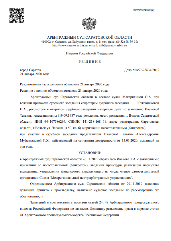 Руководствуясь статьями 20.6, 52, 59, 213.1, 213.6, 213.9, 213.24 Федерального закона от 26.10.2002 №127-ФЗ «О несостоятельности (банкротстве)», статьями 167-170, 223 Арбитражного процессуального кодекса Российской Федерации, арбитражный суд РЕШИЛ: Иванову Татьяну Александровну (19.09.1987 года рождения, место рождения: г. Вольск Саратовской области, ИНН 644107586299, СНИЛС 141-218-168 19, адрес регистрации: Саратовская область, г.Вольск ул. Чапаева, д.50, кв. 6) признать несостоятельным (банкротом).