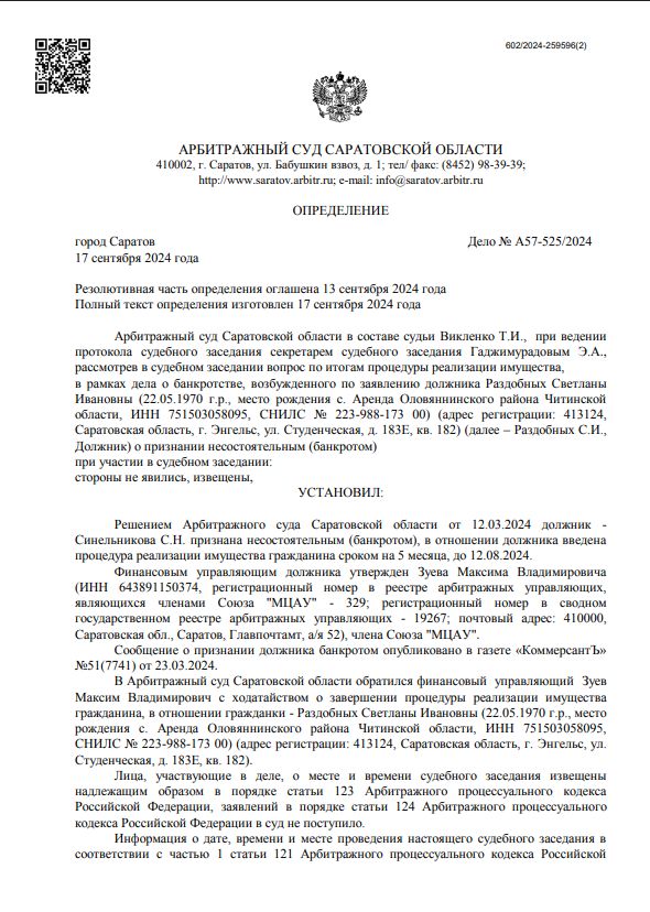 Завершить процедуру реализации имущества в отношении Раздобных Светланы Ивановны.