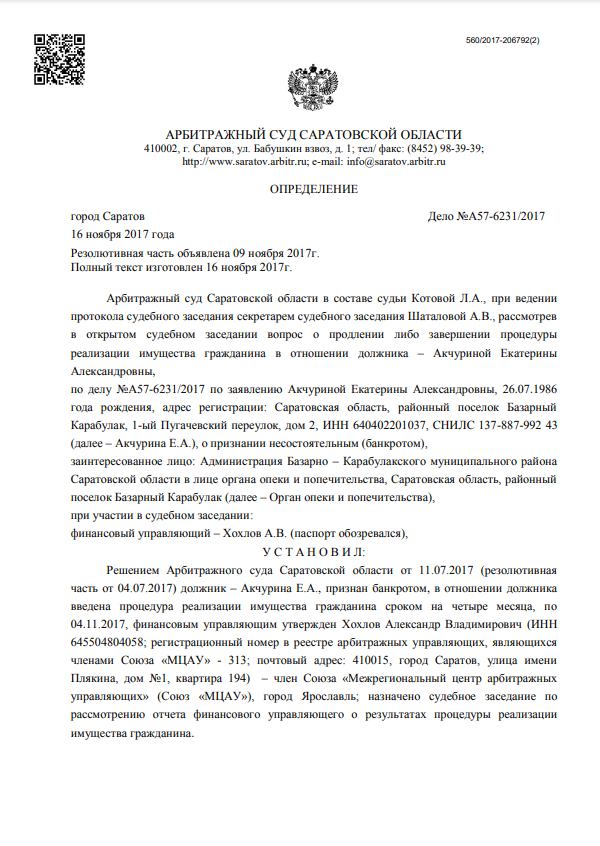 Арбитражный суд Саратовской области в составе судьи Котовой Л.А., при ведении протокола судебного заседания секретарем судебного заседания Шаталовой А.В., рассмотрев в открытом судебном заседании вопрос о продлении либо завершении процедуры реализации имущества гражданина в отношении должника – Акчуриной Екатерины Александровны, по делу №А57-6231/2017 по заявлению Акчуриной Екатерины Александровны, 26.07.1986 года рождения, адрес регистрации: Саратовская область, районный поселок Базарный Карабулак, 1-ый Пугачевский переулок, дом 2, ИНН 640402201037, СНИЛС 137-887-992 43 (далее – Акчурина Е.А.), о признании несостоятельным (банкротом), заинтересованное лицо: Администрация Базарно – Карабулакского муниципального района Саратовской области в лице органа опеки и попечительства, Саратовская область, районный поселок Базарный Карабулак (далее – Орган опеки и попечительства), при участии в судебном заседании: финансовый управляющий – Хохлов А.В. (паспорт обозревался), установил: Решением Арбитражного суда Саратовской области от 11.07.2017 (резолютивная часть от 04.07.2017) должник – Акчурина Е.А., признан банкротом.