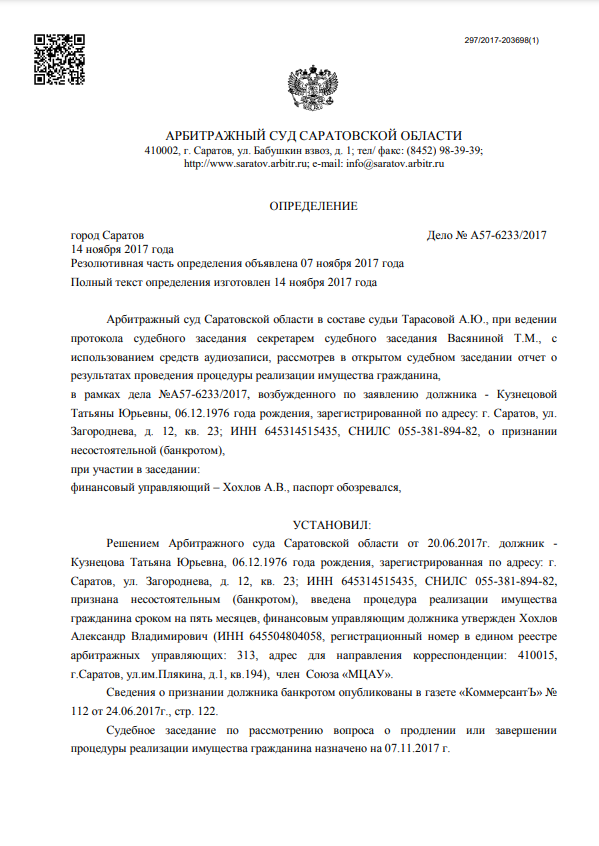 Арбитражный суд Саратовской области в составе судьи Тарасовой А.Ю., при ведении протокола судебного заседания секретарем судебного заседания Васяниной Т.М., с использованием средств аудиозаписи, рассмотрев в открытом судебном заседании отчет о результатах проведения процедуры реализации имущества гражданина, в рамках дела №А57-6233/2017, возбужденного по заявлению должника - Кузнецовой Татьяны Юрьевны, 06.12.1976 года рождения, зарегистрированной по адресу: г. Саратов, ул. Загороднева, д. 12, кв. 23; ИНН 645314515435, СНИЛС 055-381-894-82, о признании несостоятельной (банкротом)