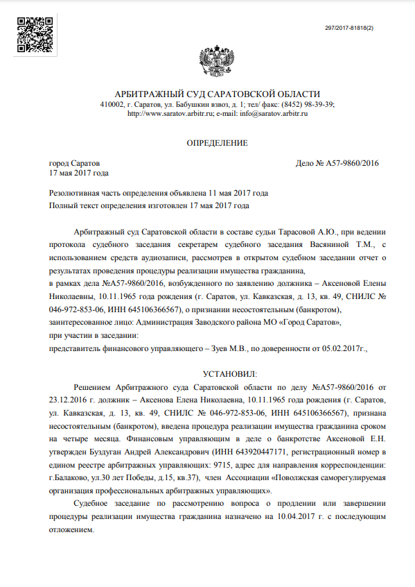 в рамках дела №А57-9860/2016, возбужденного по заявлению должника – Аксеновой Елены